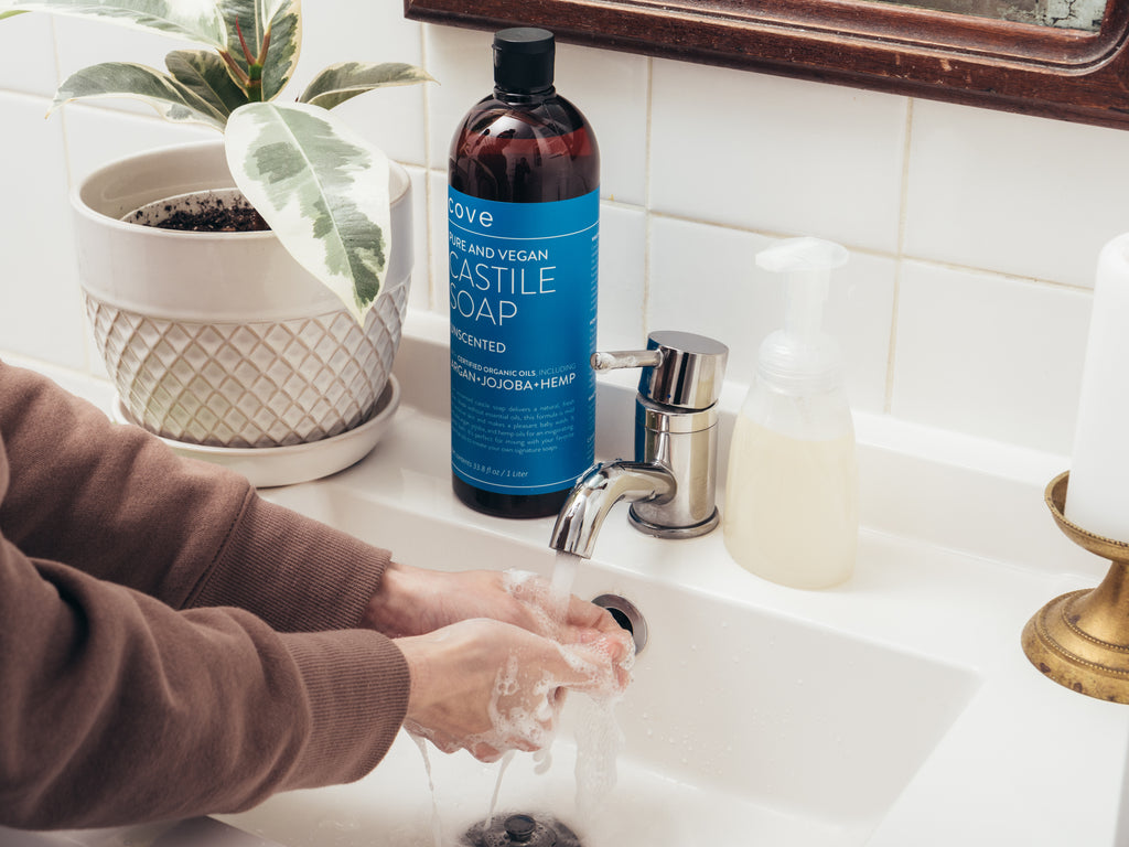 Mix 1/2 cup Castile soap with 1/2 cup distilled water. Optionally, add 10 to 15 drops of your favorite essential oil.